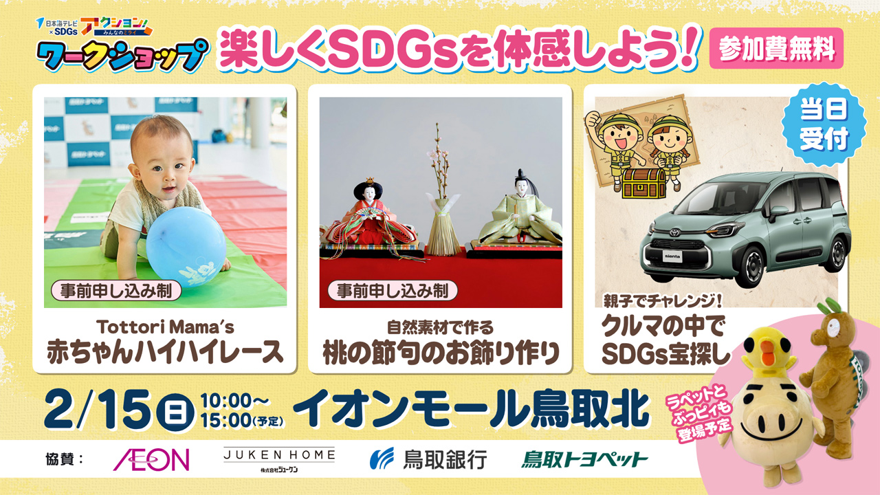 日本海テレビでは未来を担う子供たちを育む一助にしたいと「アクション!みんなのミライ」として、絵本の読み聞かせや環境絵画コンクールなど様々な事業を行っています。2020年度からは主に幼児~小学生を対象に、SDGsを体感できるワークショップを山陰両県で開催しています。
