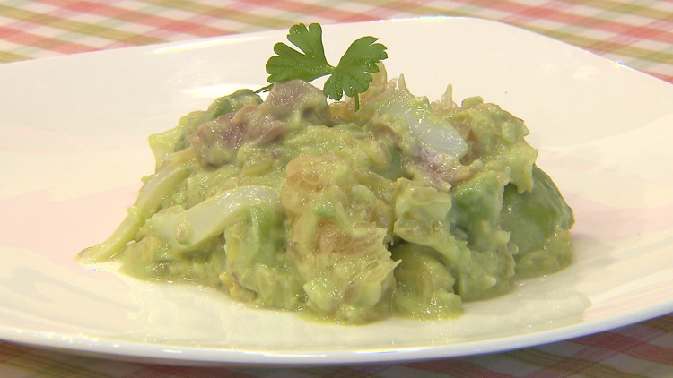 ①アボカドの皮をむき、適当な大きさに切り、ボウルに入れてレモンを絞って汁を加え木べらで混ぜる