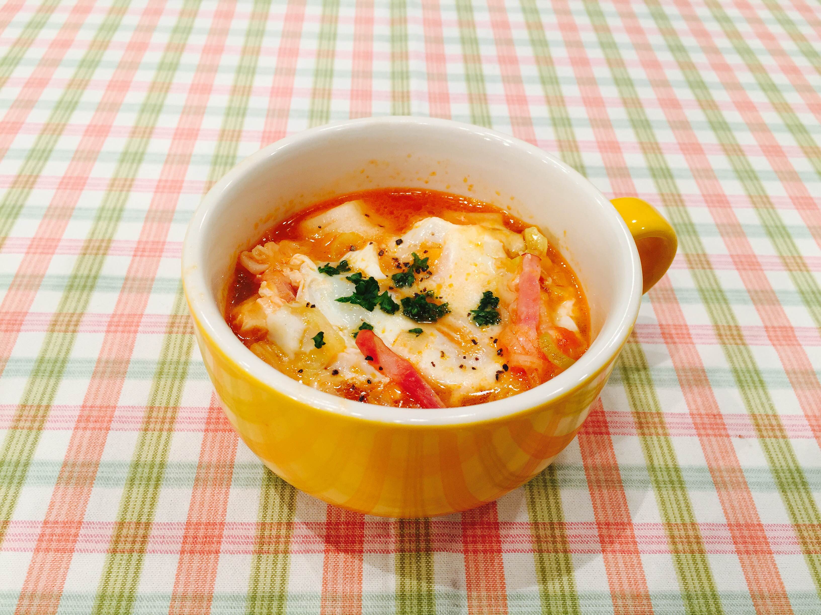 | 材料 | 【2人前】 ○白ねぎ 1本 ○ベーコン 1枚 ○キャベツ 1/16個 ○ひよこ豆(水煮)大さじ2 ○えのき 1/4束 ○トマトソース(市販)50g ☆角もち 1個 ○卵 2個 ○ミックスチーズ 大さじ2 ○オリーブオイル 大さじ1 ○顆粒コンソメ 小さじ1/2 ○塩 小さじ1/2 ○こしょう 適量 ○パセリ 適量 |
