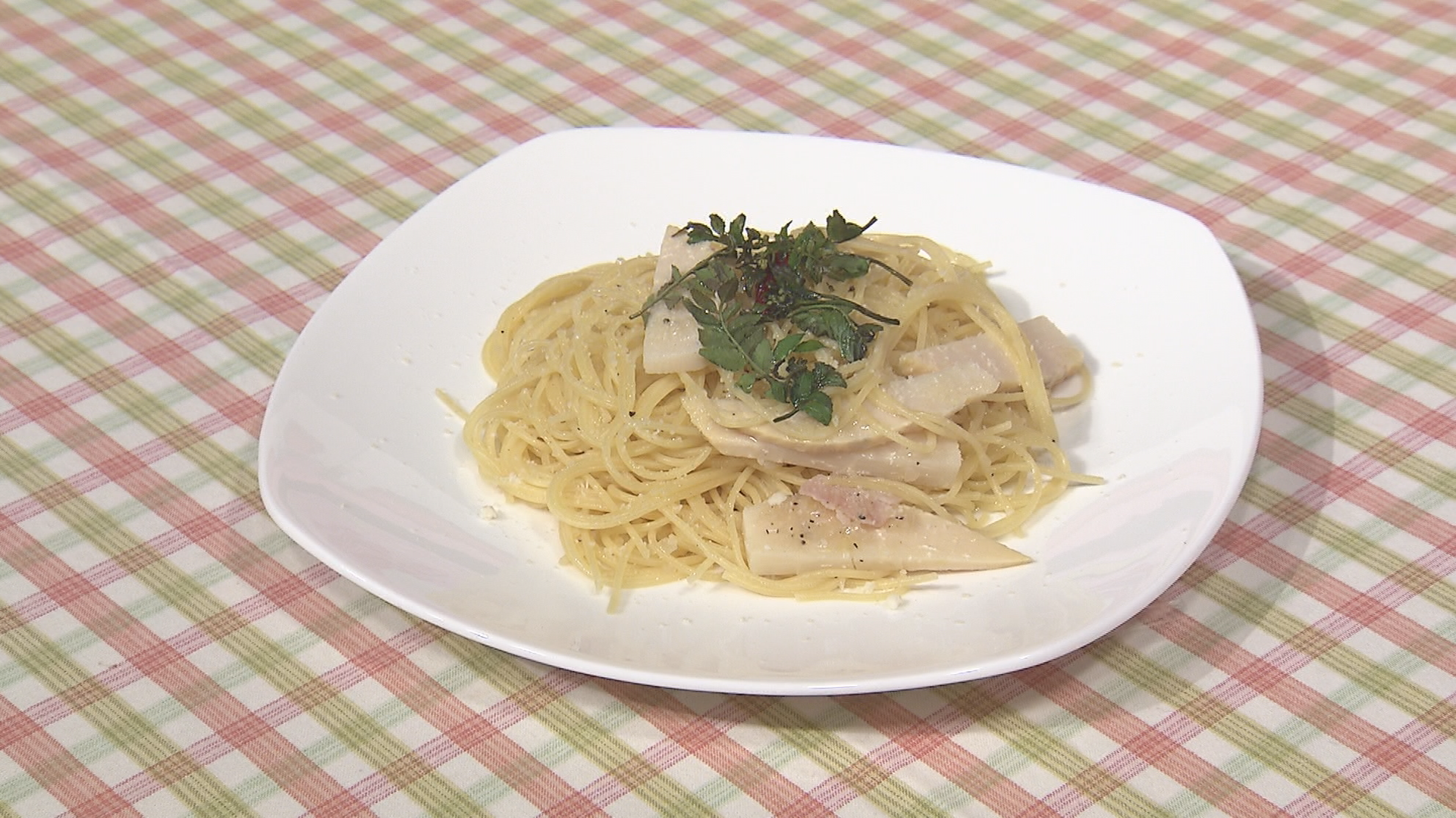 | 作り方 | ①昆布を半日から1日水に漬けておく ②たけのこを拍子切りに、玉ねぎをみじん切りにしておく ③①を沸騰させ、塩を加え、パスタ・たけのこを入れて茹でる。 ④オリーブオイルをひいたフライパンに縦割りにして潰したにんにくを入れ、きつね色になったら種を抜いた鷹の爪を割って入れる。 ⑤ベーコン・玉ねぎを入れて炒める ⑥塩・コショウで味を調え、白ワインでフランベする ⑦パスタの茹で汁を加え、ソースを乳化させる ⑧お皿に盛り付け、パルメザンチーズ・木の芽を加える |