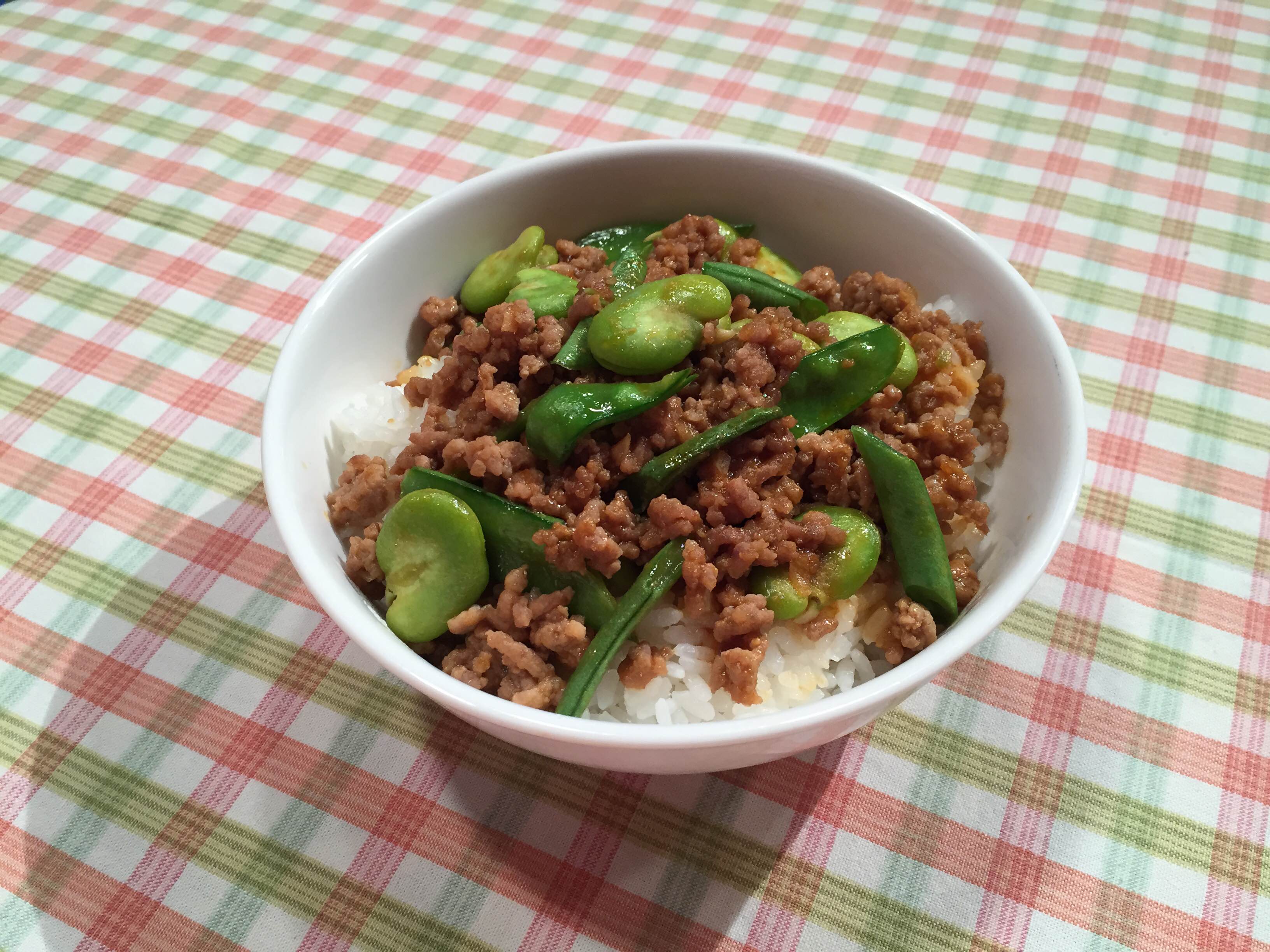 | 作り方 | ①豆類は皮やすじを取り、熱湯でさっと塩茹でする。にんにく・しょうがはみじん切 りにし、ごま油以外の調味料は混ぜ合わせておく。 ②フライパンにごま油を熱し、にんにく・しょうがを炒めて香りがでたら、豚肉を加 えて炒める。 ③肉の色が変わったら調味料を加えて全体にからめながら火をとおす。 ④なじんだら下茹でした豆類を加え、全体を炒め合わせたらできあがり。 炊きたてごはんのせて、スプーンでどうぞ! ※レモン汁を加えることで味がひきしまり、しょうがやにんにくの香りも引き立ちま す。 |