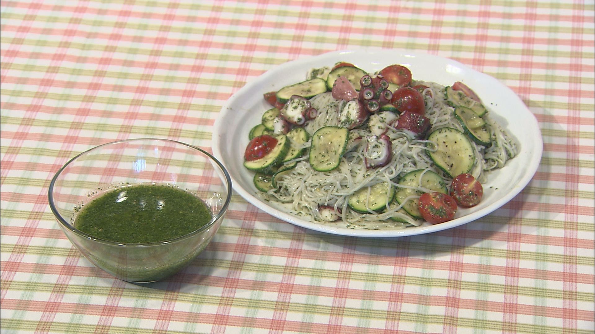 ③ボウルに青じそジェノベーゼを入れて、麺つゆでのばし、①をいれて混ぜる