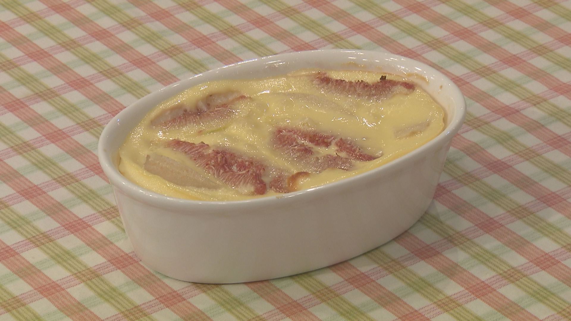 ④無塩バターをぬったグラタン皿に切った梨を入れ、その上から③を注ぎ、上にいちじくをのせる