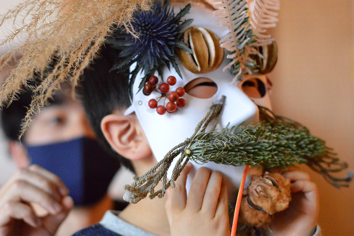 鬼といってもこわいだけでなく、おもしろい鬼、優しい鬼、友達になりたい鬼、いろいろです。たとえばお母さんが怒ったときはどんな鬼になる?そんな話からイメージをふくらませて、さっそく制作スタート!思い思いの植物を手に取り、仮面をデコレーションしていきます...