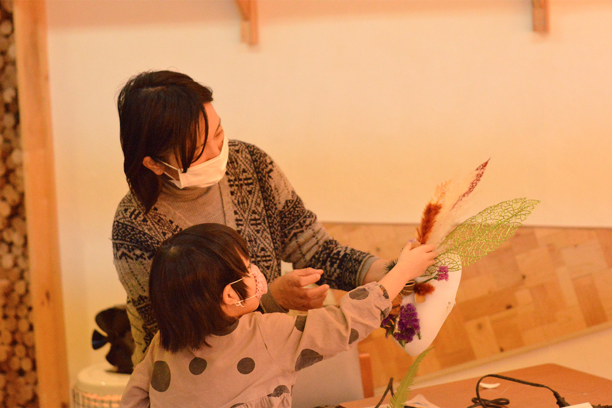 節分にちなんで、廃棄予定のドライフラワーでオニの仮面を作るワークショップです。