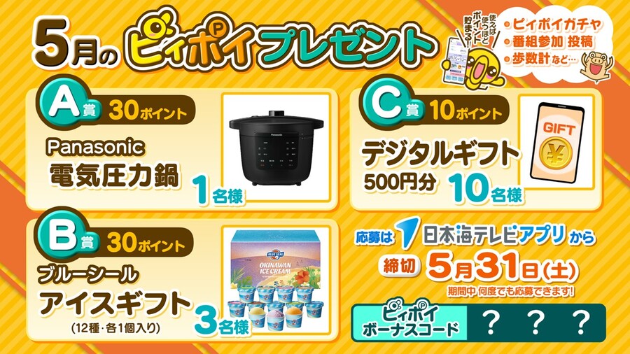 日本海テレビで放送している、ピィポイCMに隠れている「ボーナスコード」見つけてアプリに入力!するとポイントゲット!