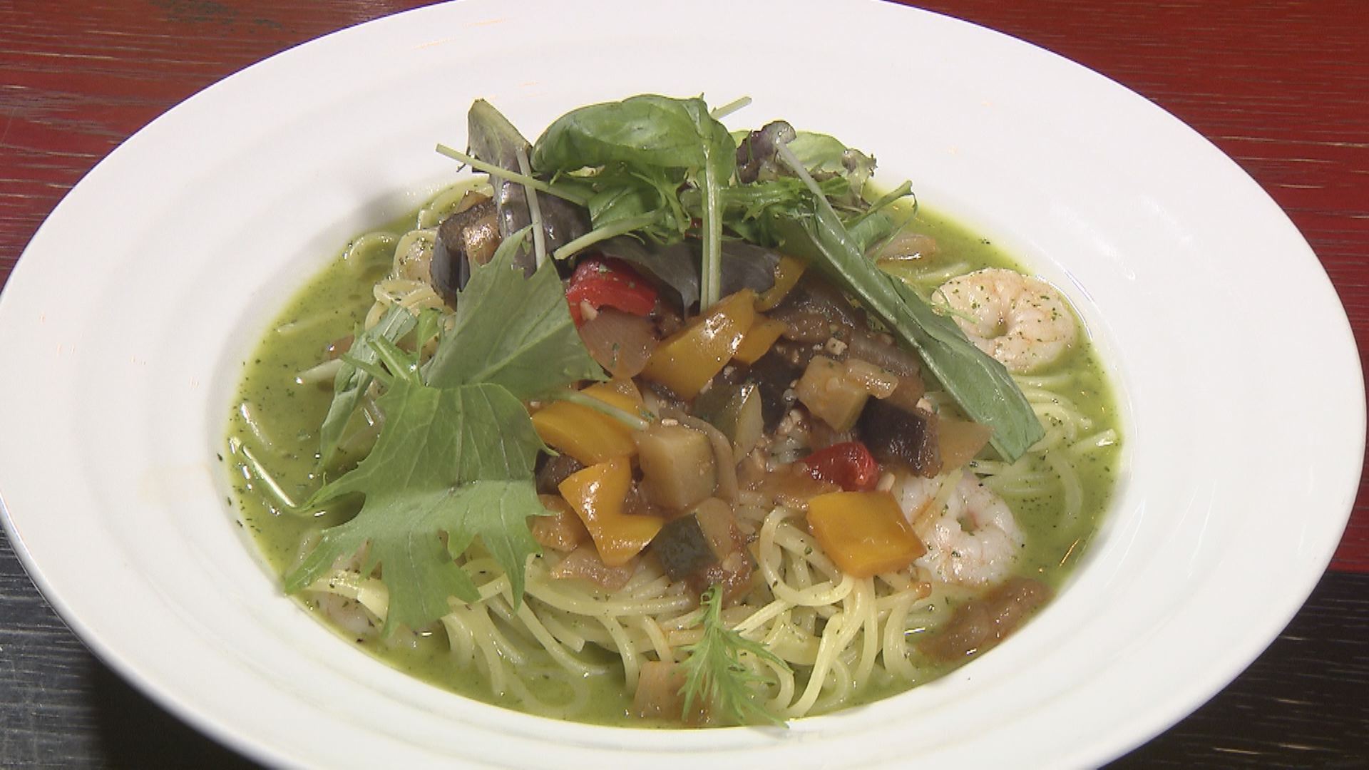| 紹介文 | 多国籍なメニューが楽しめる松江のカフェ。 若い方から年配の方まで幅広い世代が楽しめる落ち着いた空間で、 ランチタイムはいつも賑わっている。 パスタランチセット1,180円(税込) ※パスタの内容は週替わり。放送時は「ラタトゥーユ乗せ海老のバジルパスタ」 |