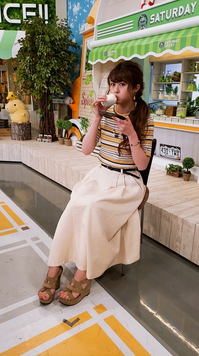 ・マルチボーダーTシャツ・撥水ホワイトAラインスカート(ライトオン鳥取トリニティモール店)・イヤリング(アトリエeggスキーマ)
