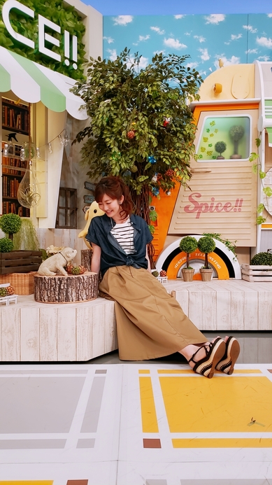 ・リブクルーTシャツ・デニムシャツ・グルカスカート(ライトオン鳥取トリニティモール店)・イヤリング(アトリエeggスキーマ)