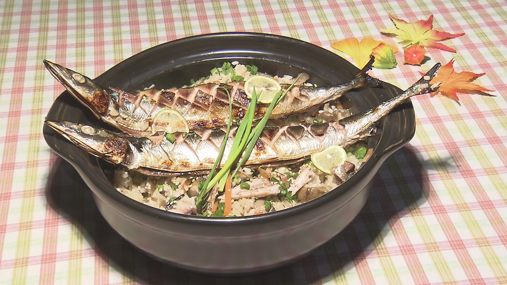 | 作り方 | 【作り方】 ①サンマ2尾を塩焼きにして2等分する。残りをひと煮立ちさせた漬け込みダレに2時間ほど付けた後、フライパンで焼いておく。 ②しめじ、まいたけは子房にわけ、にんじんは拍子切り、ゴボウはささ切り、ショウガは千切りにし、わけぎは小口切りにしておく。 ③米2・5合ともち米0.5合を図ってあわせておく。 ④合わせ出汁をひと煮立ちさせておく。 ⑤米を土鍋に入れ、540ccの合わせ出汁をそそぐ。次に野菜類をいれて、その上に塩焼きしたサンマをのせる。 ⑥初めは強火で、沸騰したら弱火にして15分ほど炊き、10分蒸らす。 ⑦サンマの身をほぐし、わけぎをちらし、カボスを絞って全体を混ぜる。 ⑧フライパンで焼いたサンマをのせ、山椒、白ゴマを振って出来上がり。 |