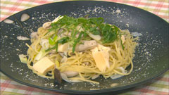 | 作り方 | ①材料を切って置く。 数の子は細かく刻む。 白ネギは斜めに薄くスライス。 しめじは軸をとって、手でほぐす。 大根は、薄く拍子きり。 大葉は、千切り。 ②熱湯に塩をいれ、指定時間スパゲッティを茹でる。 その時に大根も、一緒に茹でる。 ③フライパンにオリーブオイルをいれて温める。 ④温まったら、白ネギとシメジをいれて、しんなりするまで、炒める。 ⑤炒まったら、カツオだしをいれて、一煮立ちさせる。 ⑥火を止め、生クリームと数の子を入れ、塩で味を整える。 ⑦茹で上がったパスタを、フライパンに入れ、お好みの量の粉チーズをいれる。 ⑧お皿に盛り付けて、大葉を散らす。 お好みで、ブラックペッパー、粉チーズをかけて完成。 |